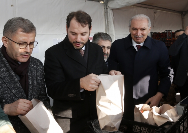 Ziyaretinde, satış stantlarının arkasına geçerek vatandaşlarla sohbet eden Albayrak, satılan ürünleri poşetlere koyarak vatandaşlara verdi.